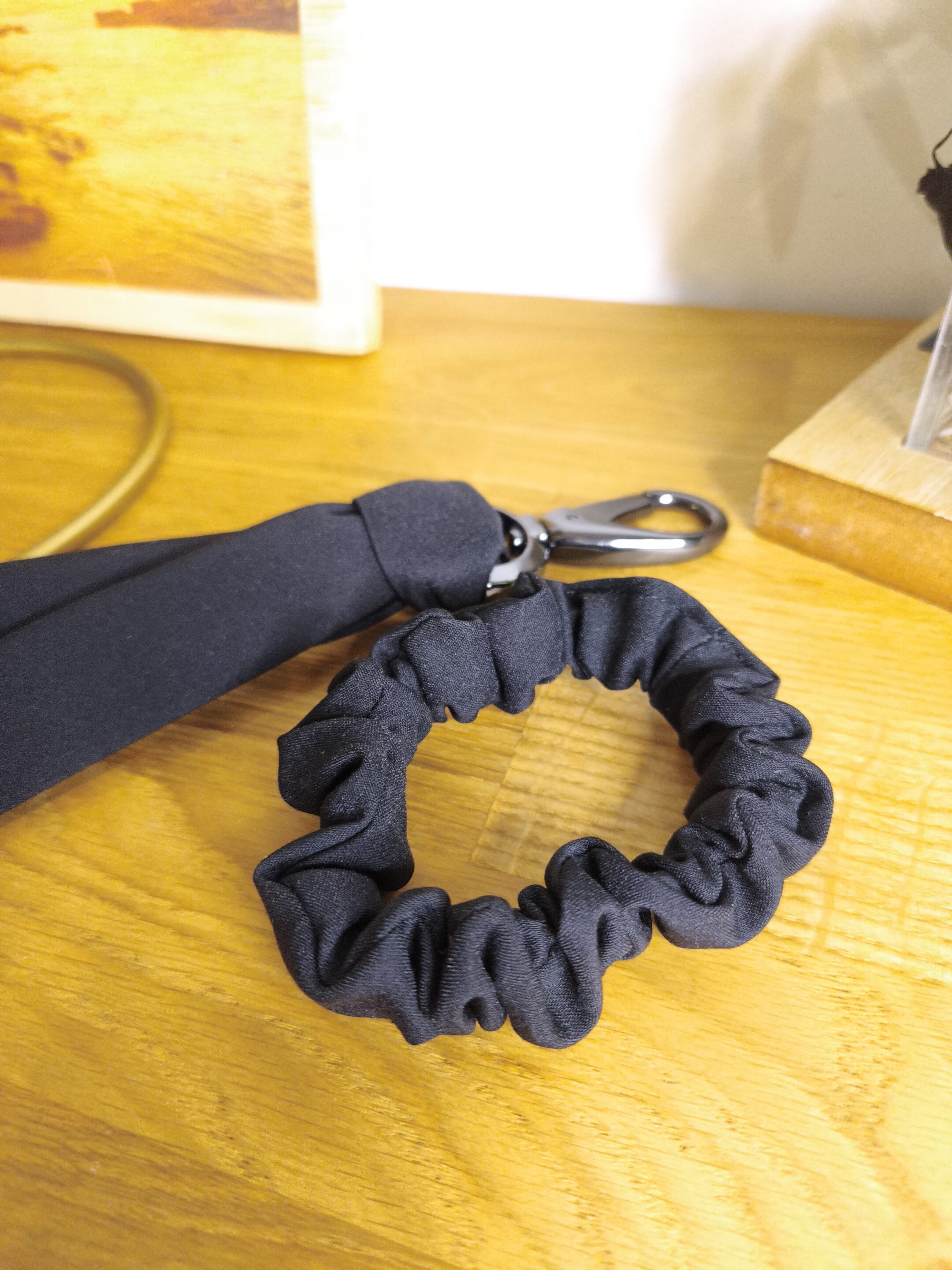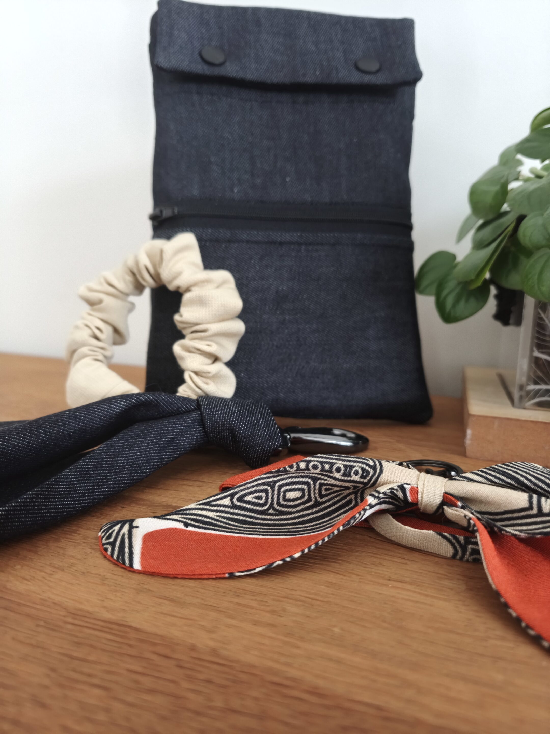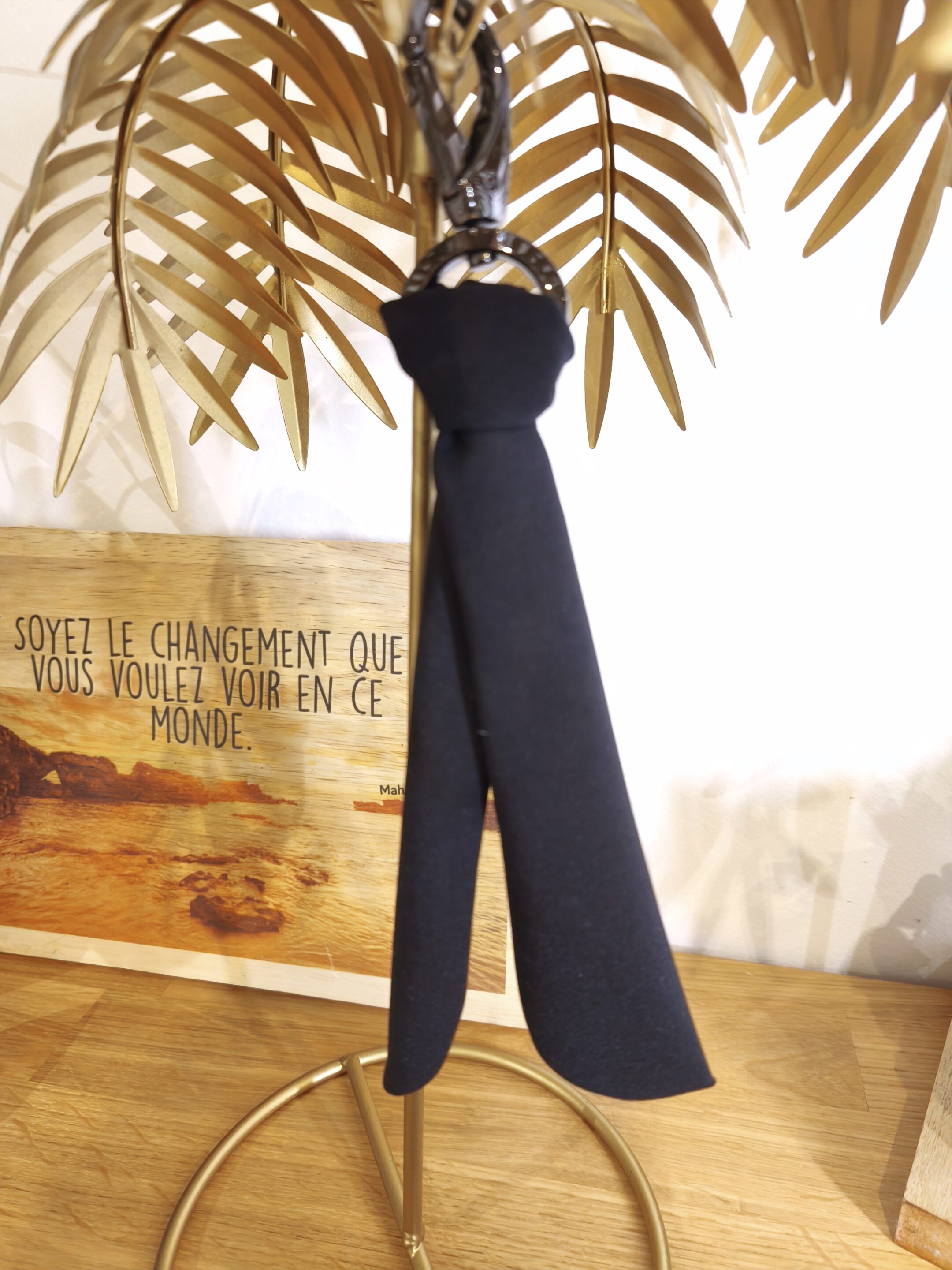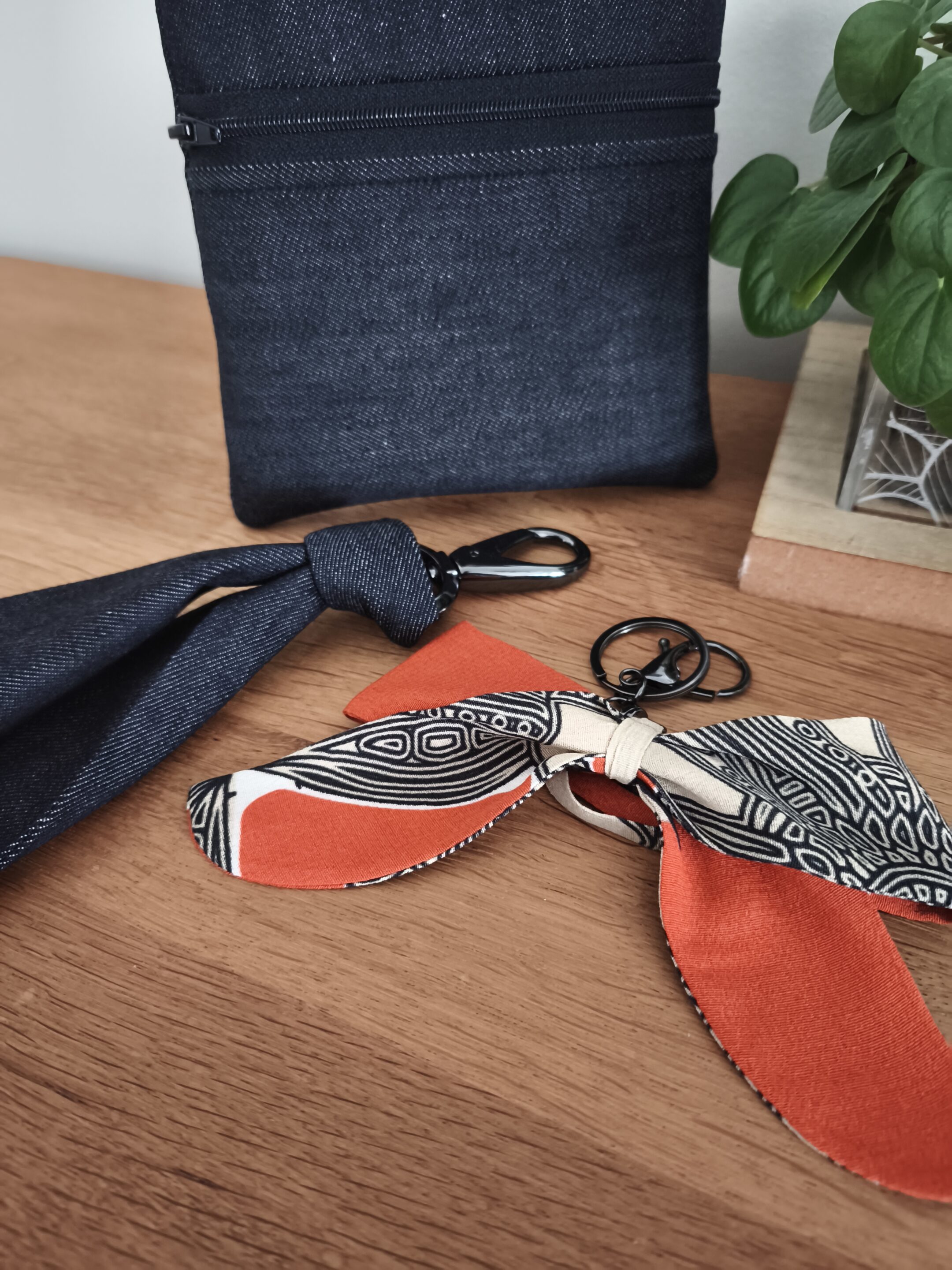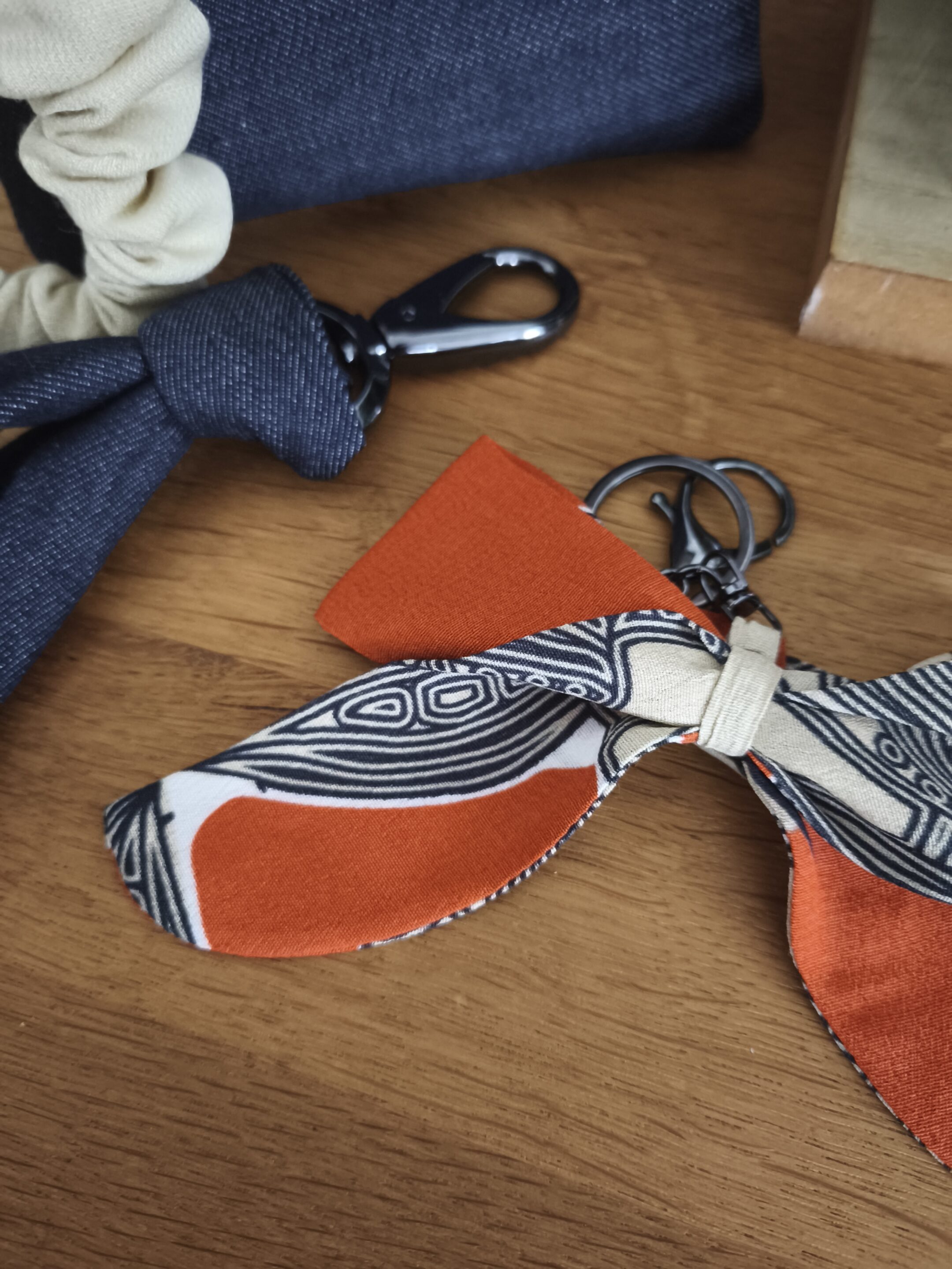 Un Charme-Clip (un mousqueton habillé d’un mini foulard noué façon cravate) à clipser sur un sac par exemple,
