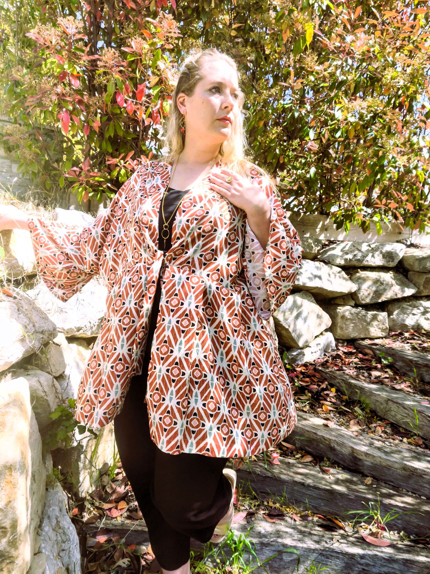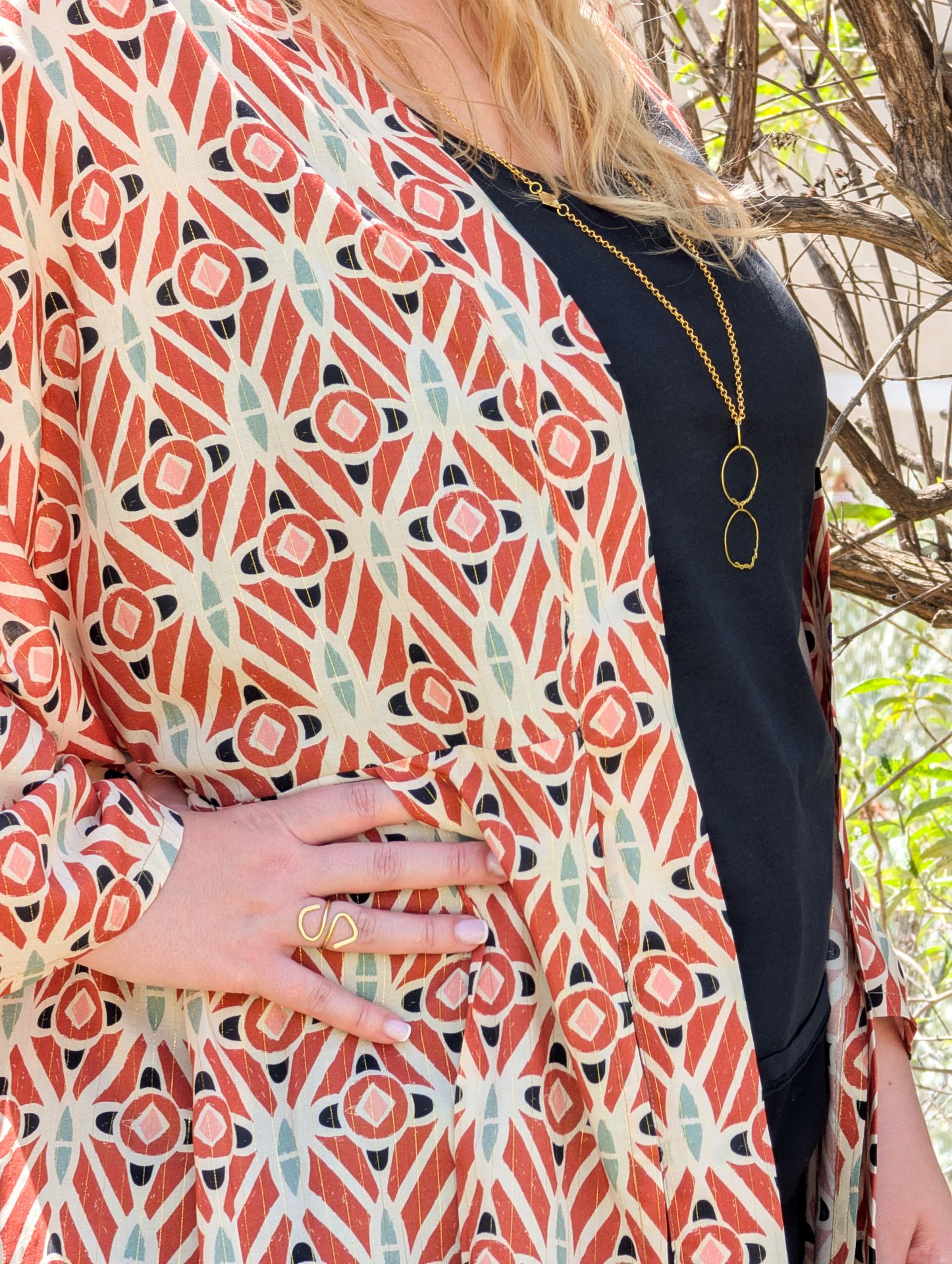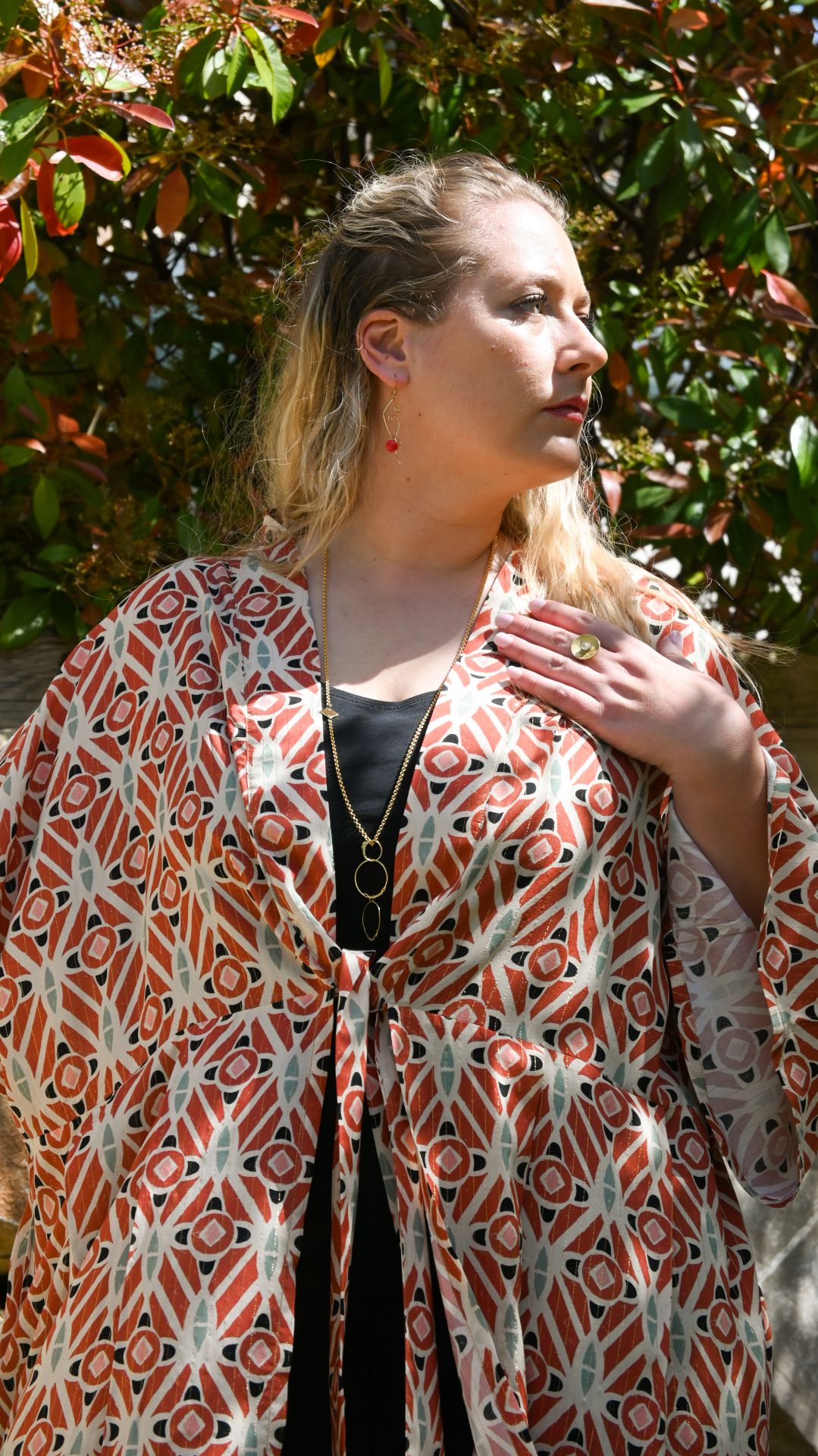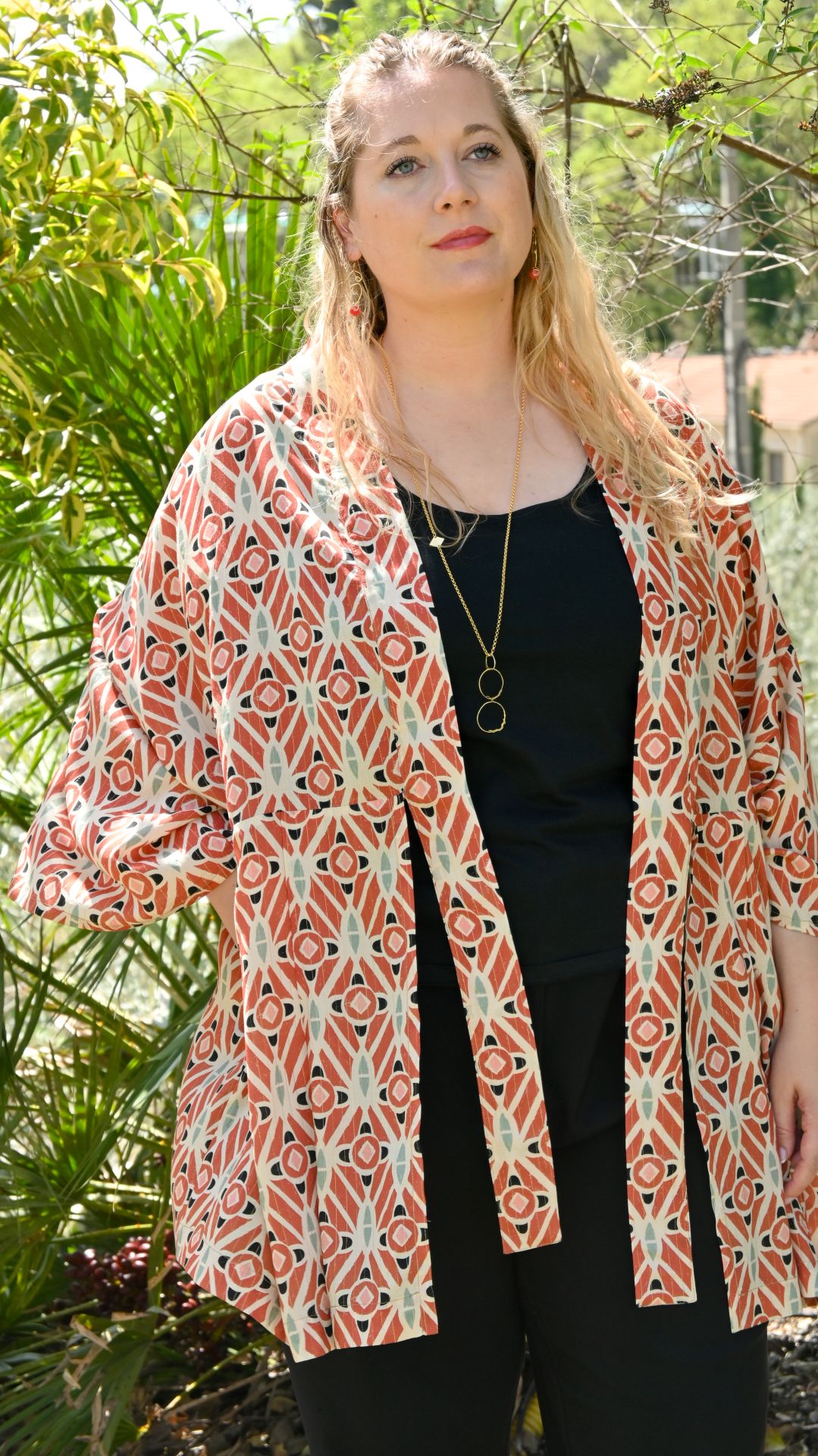 Portez ce kimono sur une base noire pour faire ressortir ses nuances terracotta et ses reflets lumineux.