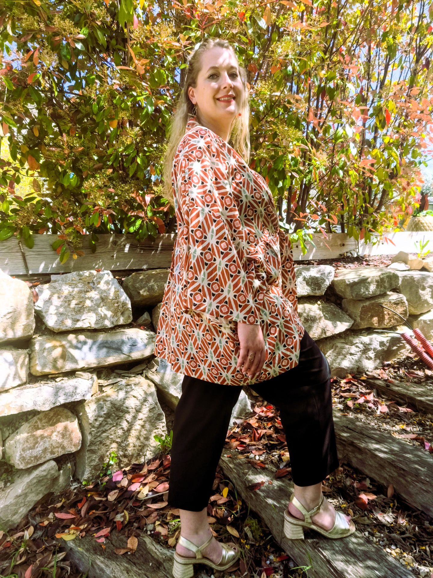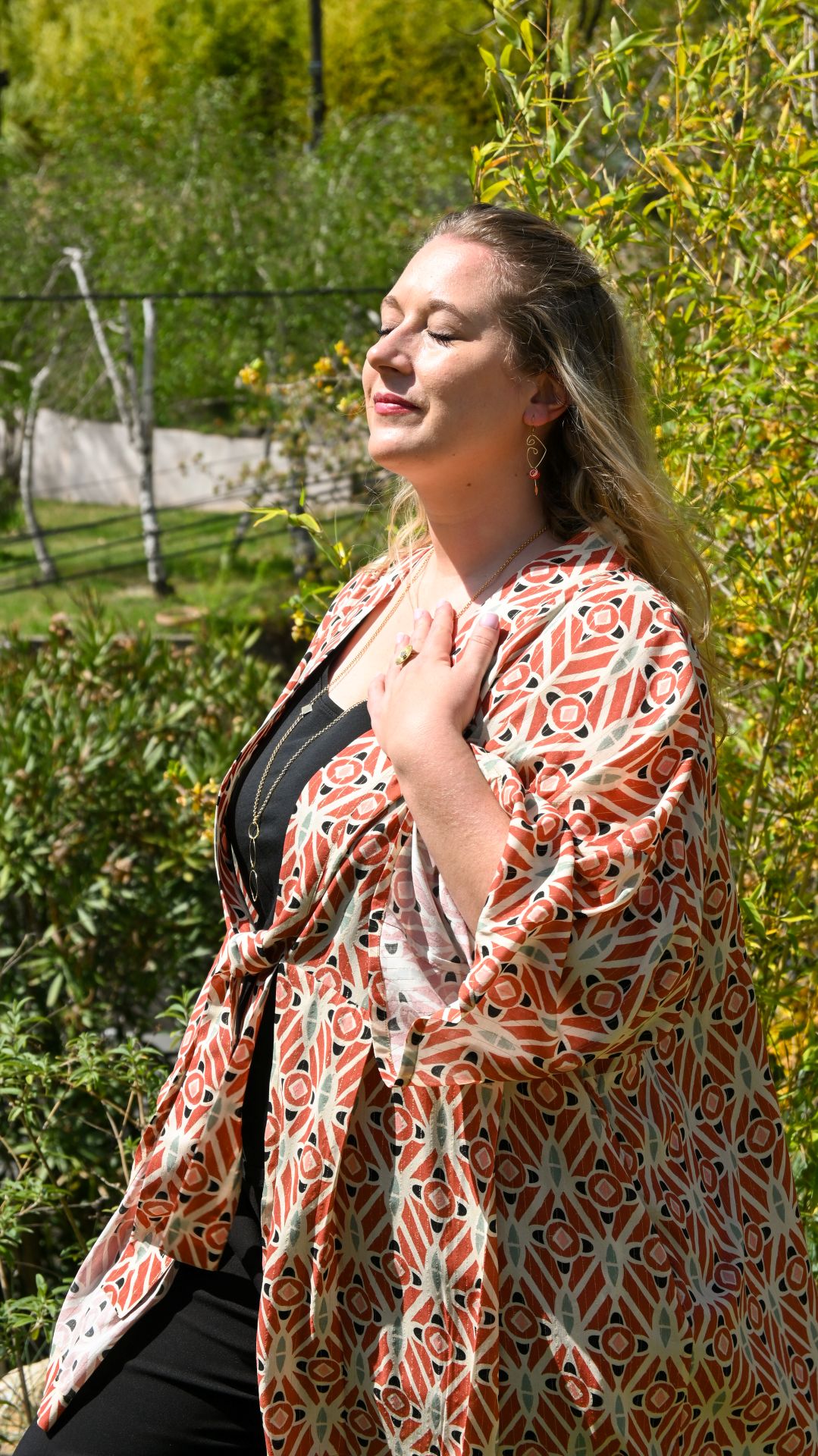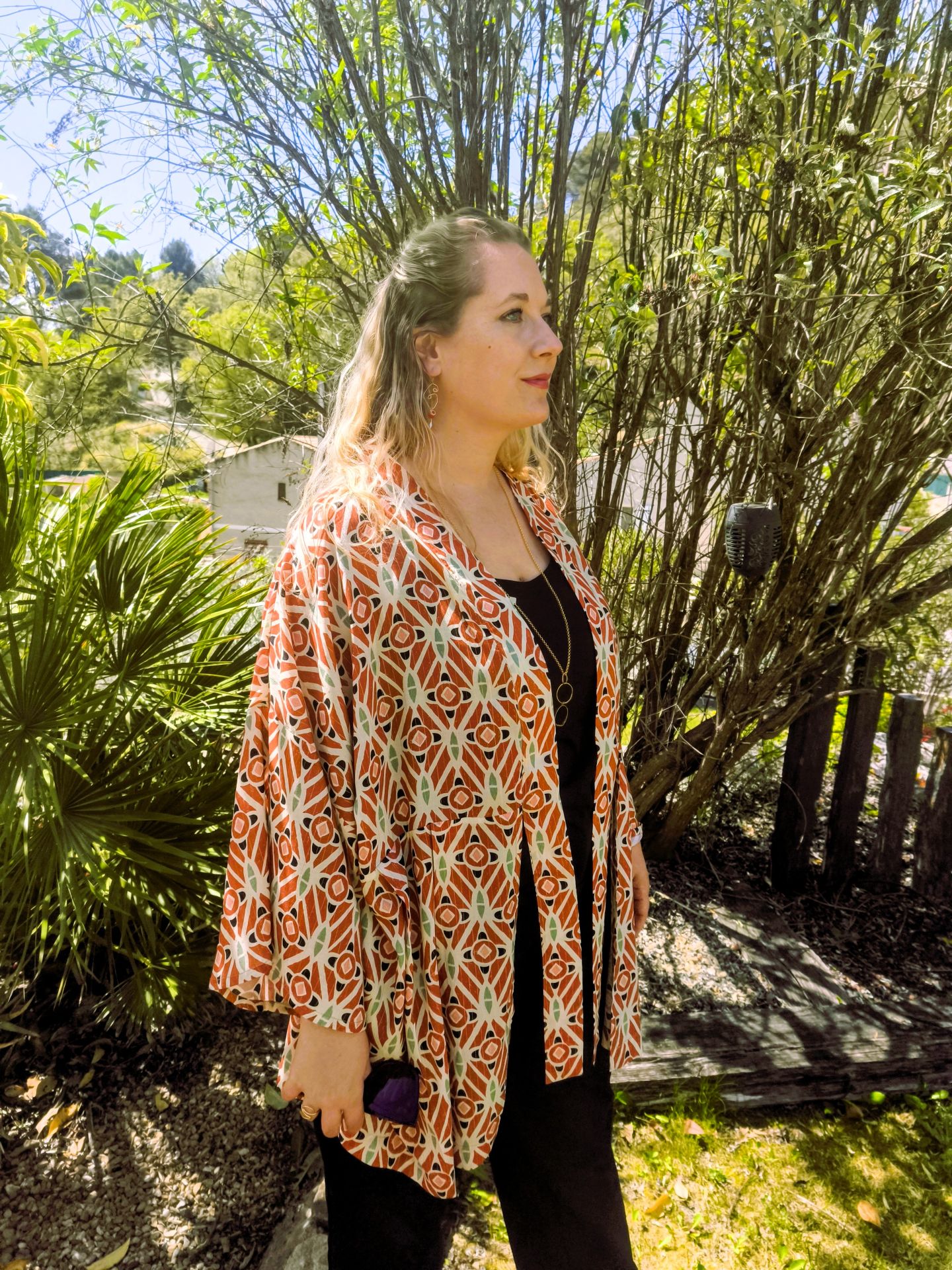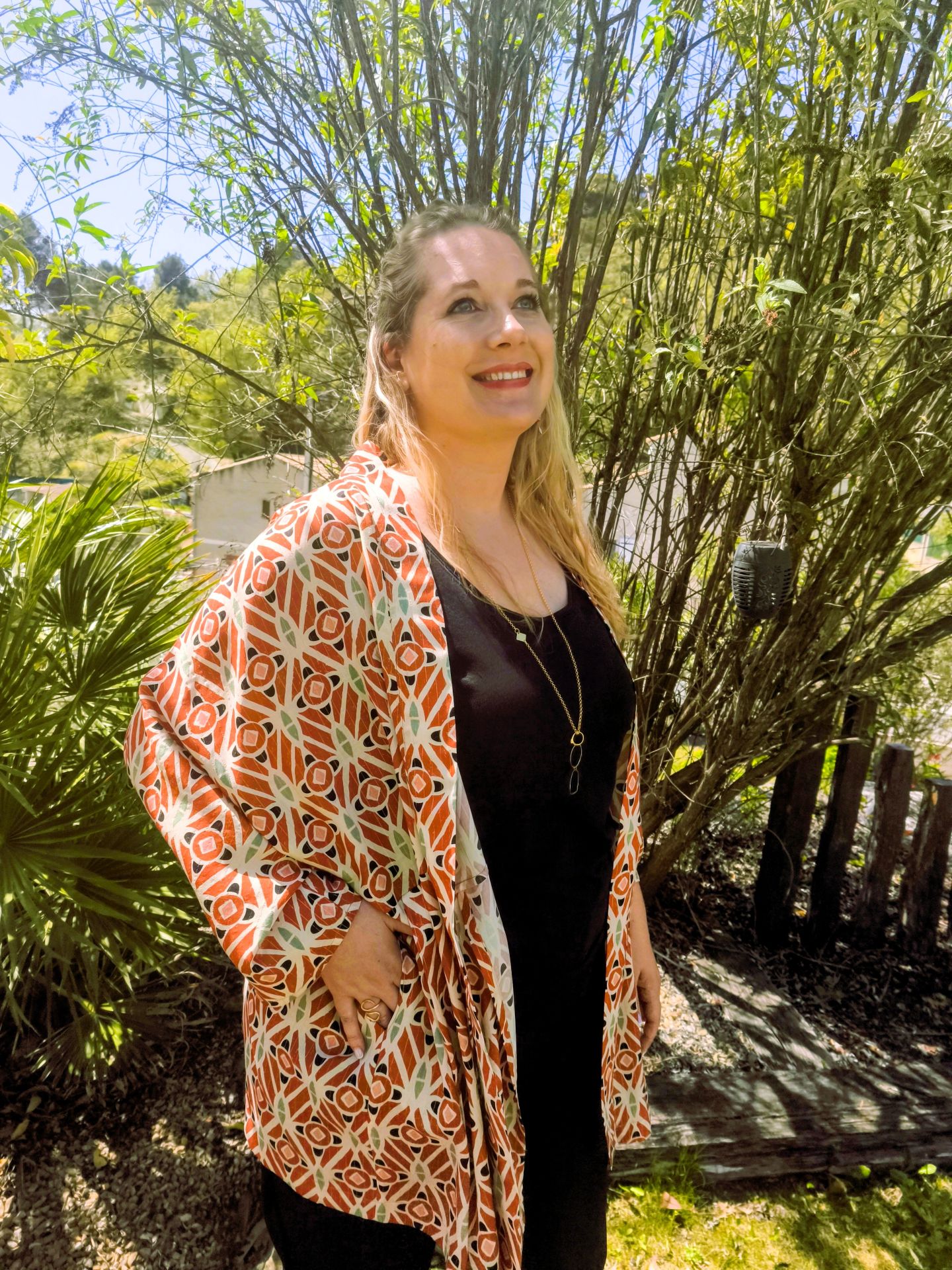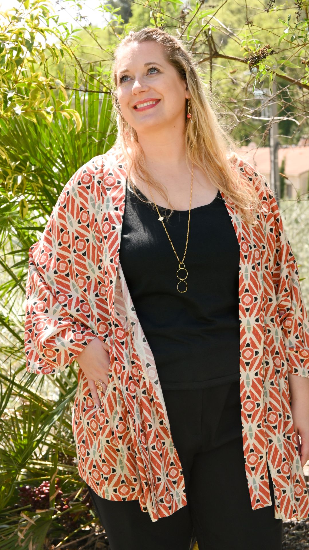 Portez ce kimono sur une base noire pour faire ressortir ses nuances terracotta et ses reflets lumineux.
