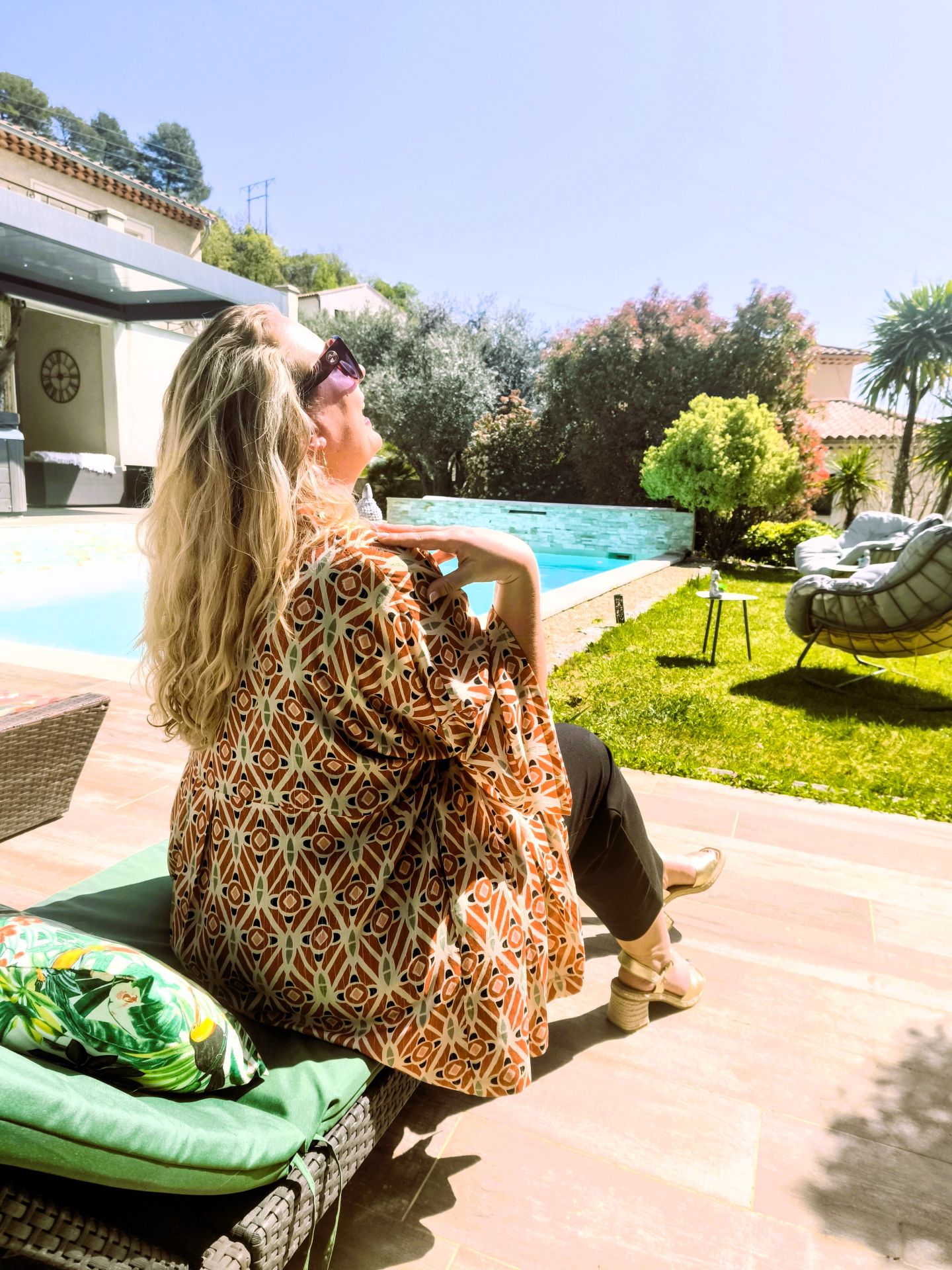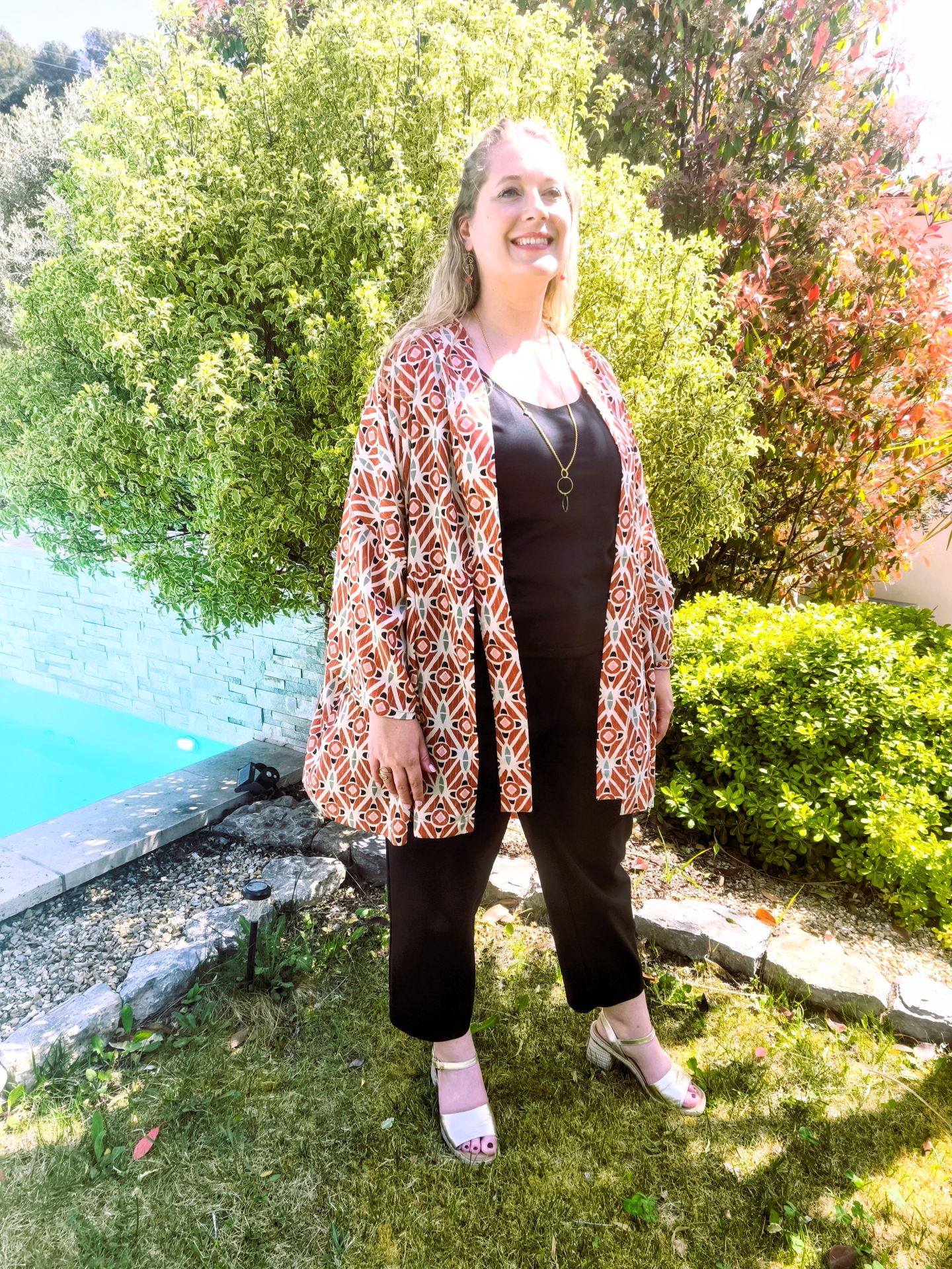 Laurine porte le kimono en taille L et le pantalon Elisa en viscose noire taille XXLove.