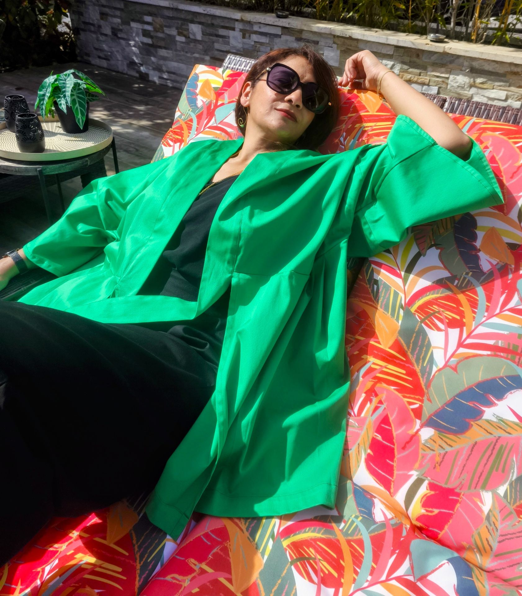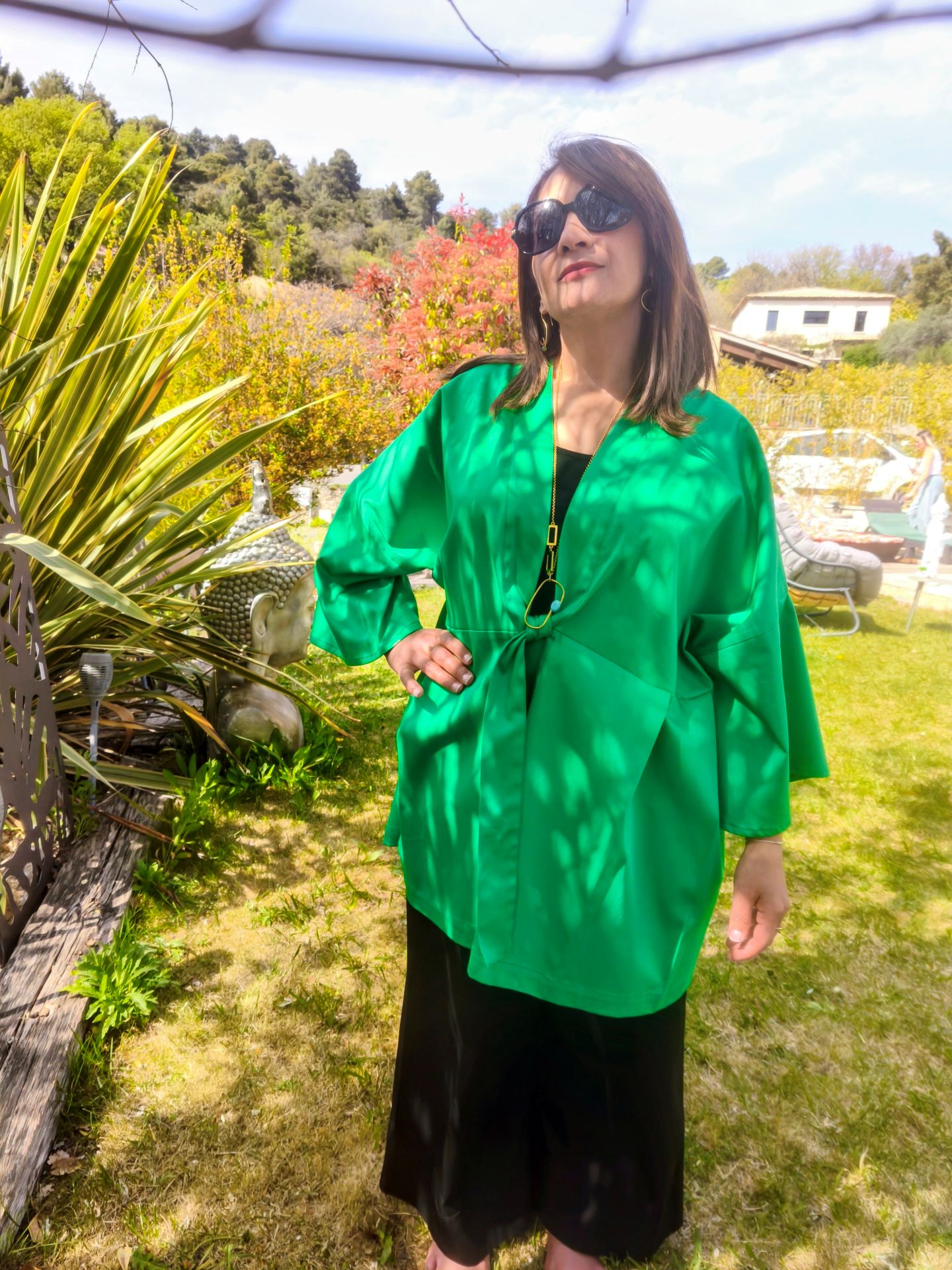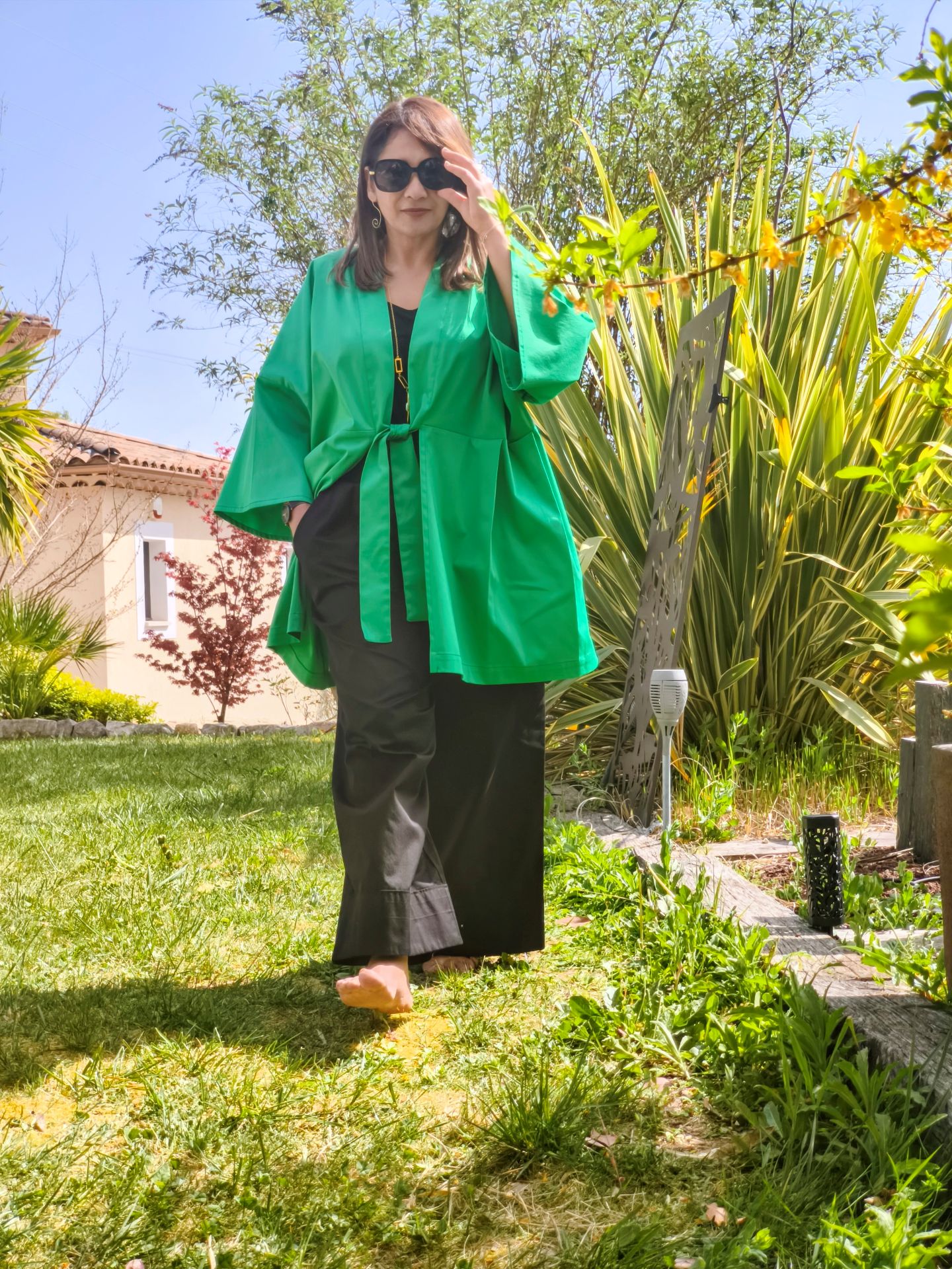 Portez ce kimono avec une base sobre pour laisser sa couleur et sa structure s’exprimer pleinement.