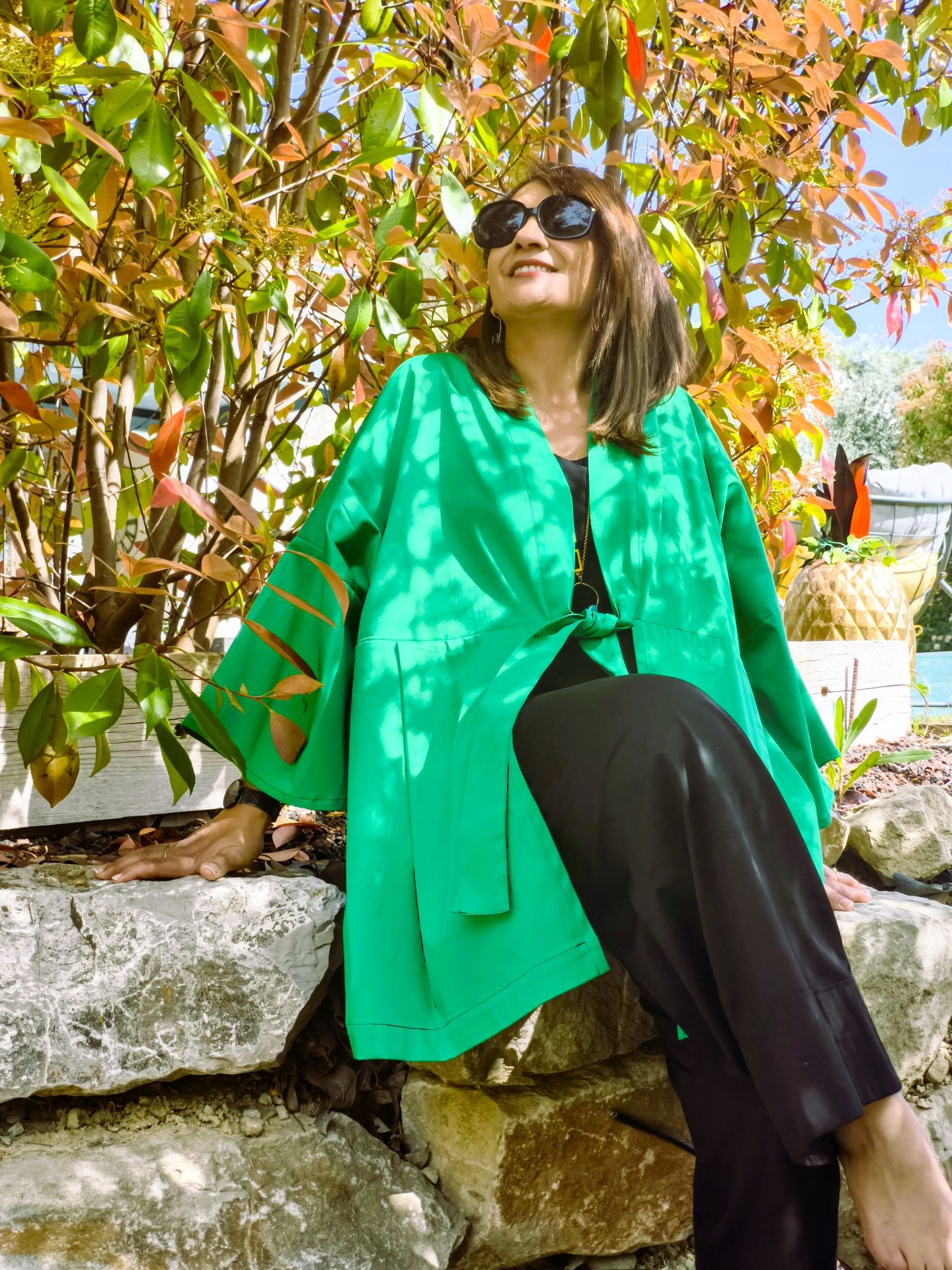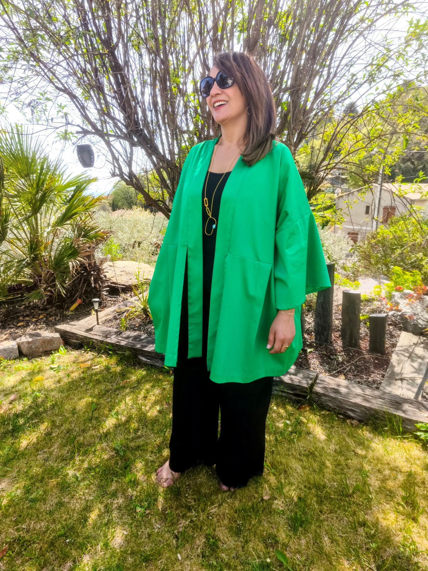 Myriam porte le kimono en taille M et le pantalon Oumie (dans le tissu du pantalon Elisa) en taille M.