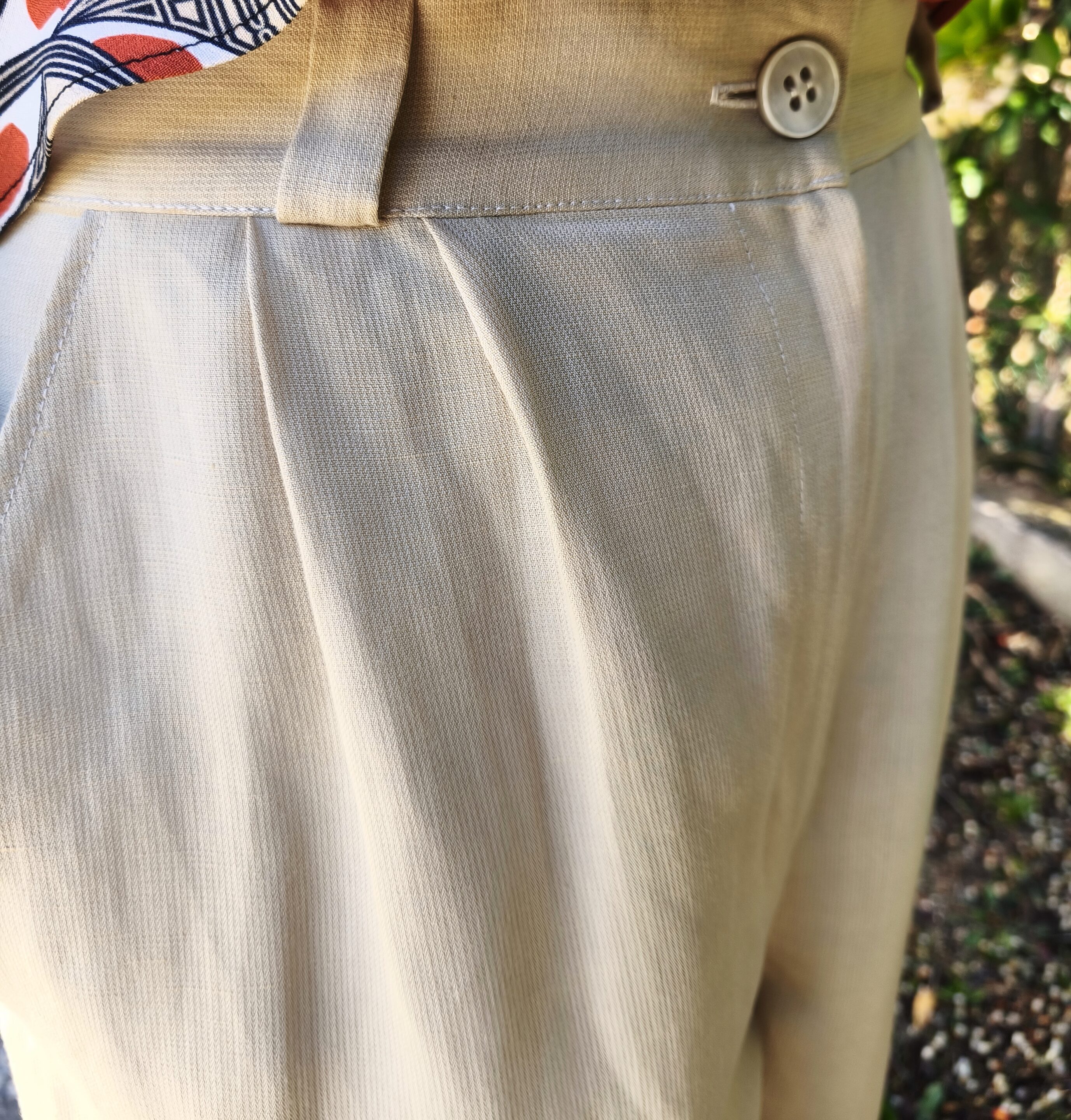 Les plis sur le devant et les pinces au dos apportent de la tenue et un joli tombé. La ceinture élastique au dos épouse le corps naturellement, tandis que les 5 passants permettent d’ajouter une ceinture pour un style plus affirmé. Les poches italiennes renforcent la praticité et le confort du modèle. Les boutons de fabrication française en corne ajoutent une touche subtile de raffinement.